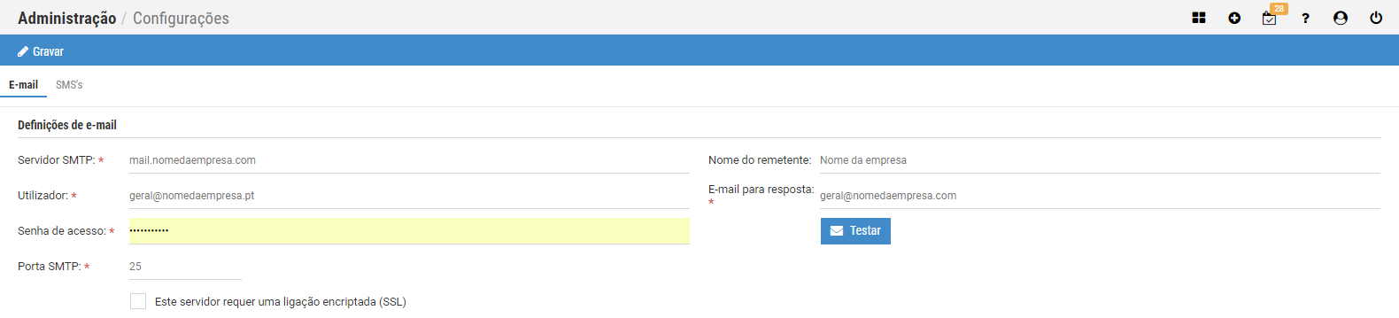 Muitas empresas usam um email para o envio, que apenas é usado dentro da plataforma, diferente do email para resposta, caso o recetor queira responder. - Depois de introduzir todos os dados, premir o botão Testar